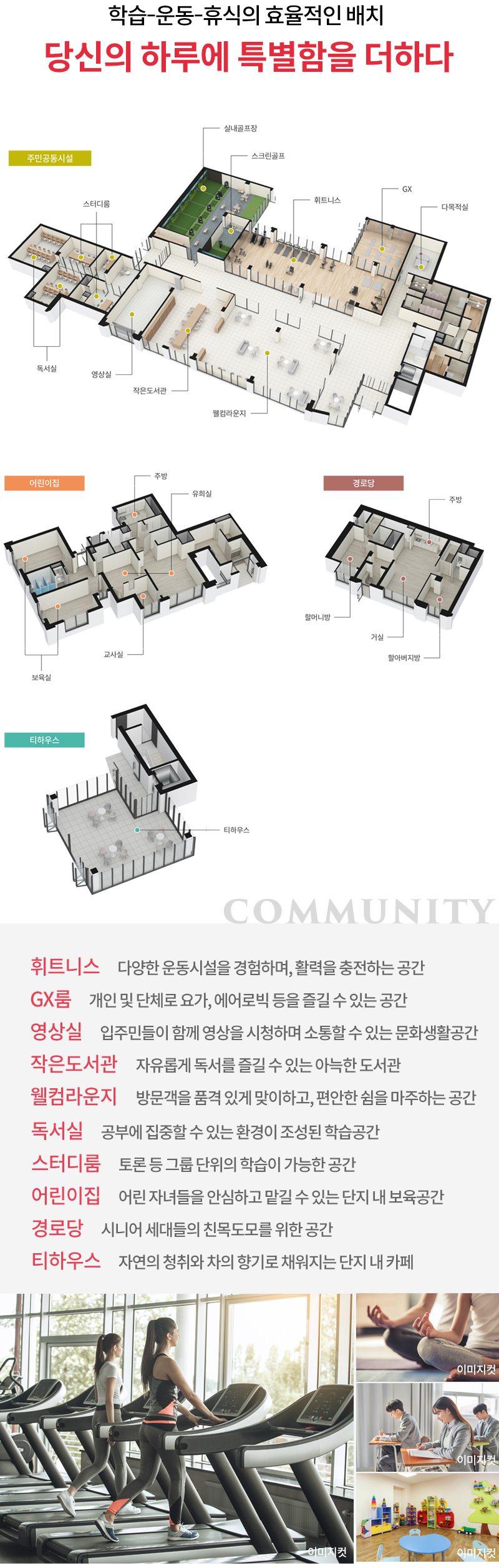 ※ 본 홈페이지의 CG컷, 이미지 등은 소비자의 이해를 돕기 위해 제작된 것으로 커뮤니티 공간의 시설물에 대한 형태,배치 및 수량과바 닥 마감은 실제 시공 시 변경될 수 있습니다.
