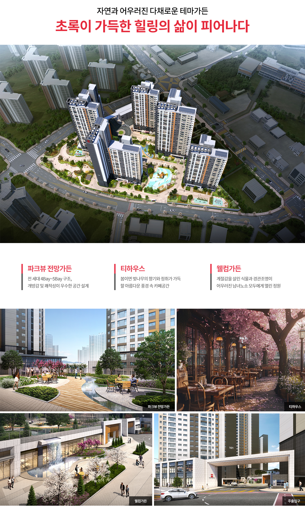 ※ 상기 조감도, 투시도, CG, 이미지 컷은 소비자의 이해를 돕기 위하여 제작된 것으로 실제와 상이할 수 있으며, 건물의 명칭, 동 표시색, 채 및 외부 상세 등은 인허가, 색채심의(또는 디자인 심의) 및 법규의 변경 등으로 인하여 실제 시공 시 변경될 수 있습니다.